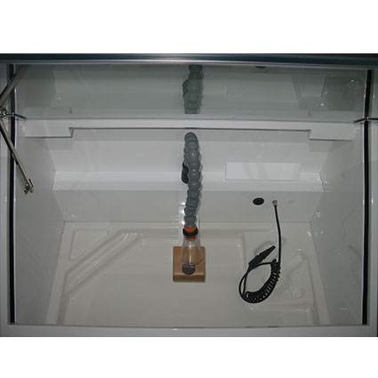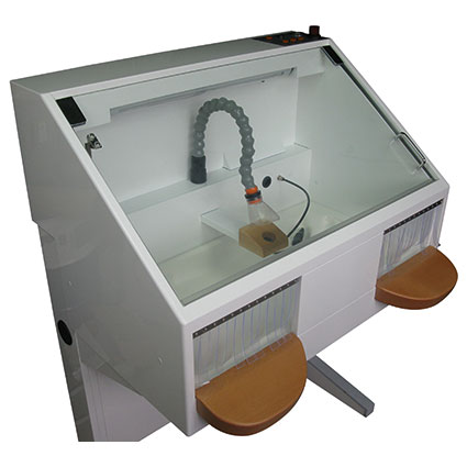 Die IP Box Arbeitseinheit wurde konzipiert um die Gesundheit des Technikers während der Schleifarbeiten zu schützen. Das Motor-Absaugsystem ist leistungsstark und Geräuscharm somit wird eine Geruchs und Staubbelästigung von Gips, Kunststoff, Metall usw. vermieden. Die Box ist mit integrierten Beleuchtung, Sicherheits-Glasscheibe, Pressluftpistole und Absaugbrüssel ausgerüstet.