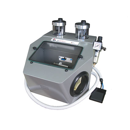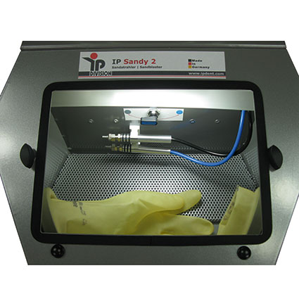 Das IP Sandy 2 Feinstrahlgerät, mit übersichtlicher Strahlkabine und kratzfester leicht auswechselbarer Sichtscheibe, dient zur Oberflächenabstrahlung von Metallen und Politur von Keramik, Kunststoffen, Zirkon u.v.m. Das Gerät ist mit zwei separaten Strahlbehältern sowie Strahlgriffel ausgestattet, die sich über einen pneumatischen Fußpedal und einer Luftweiche bedienen lassen. Im inneren der Kabine befinden sich zwei Schutzhandschuhe, ein Auffangblech sowie eine hellleuchtende LED Beleuchtung mit über 1000 Lumen Lichtleistung. Des Weiteren befindet sich am Boden der Kabine eine Ablassöffnung, um das bereits verwendete und verdreckte Strahlmittel entleeren zu können. Die Geräterückwand ist zudem mit einem Anschlussrohr für Absauganlagen ausgestattet.Das IP Sandy 2 arbeitet mit Aluminium Oxyd und Glasperlen von 50µm bis 250µm. Die Füllmenge je Strahltank liegt bei ca. 700 Gramm. Der Arbeitsdruck ist von 1 bis 7 Bar über einen Druckregler mit integriertem Kondenswasserabscheider einstellbar.